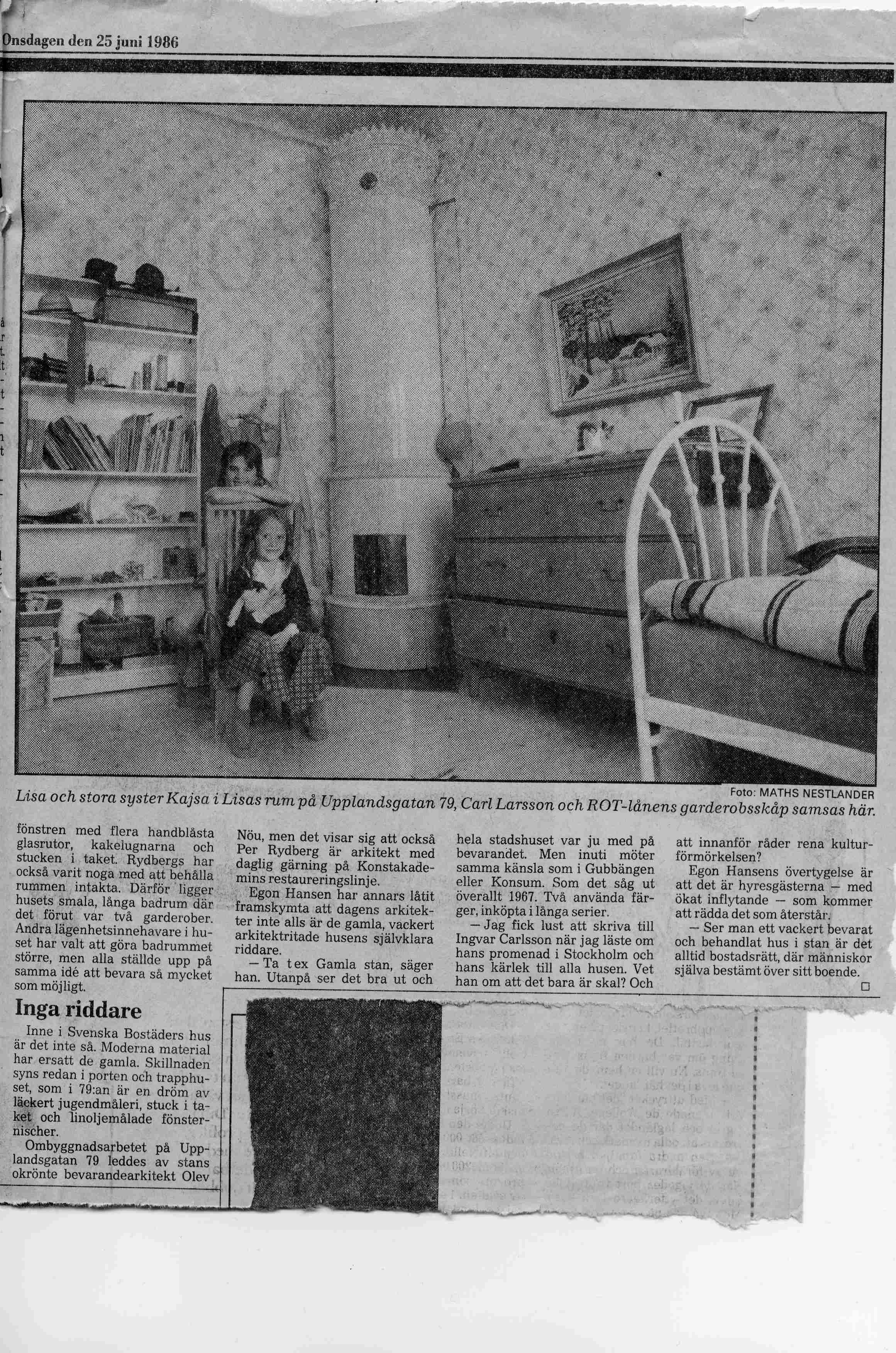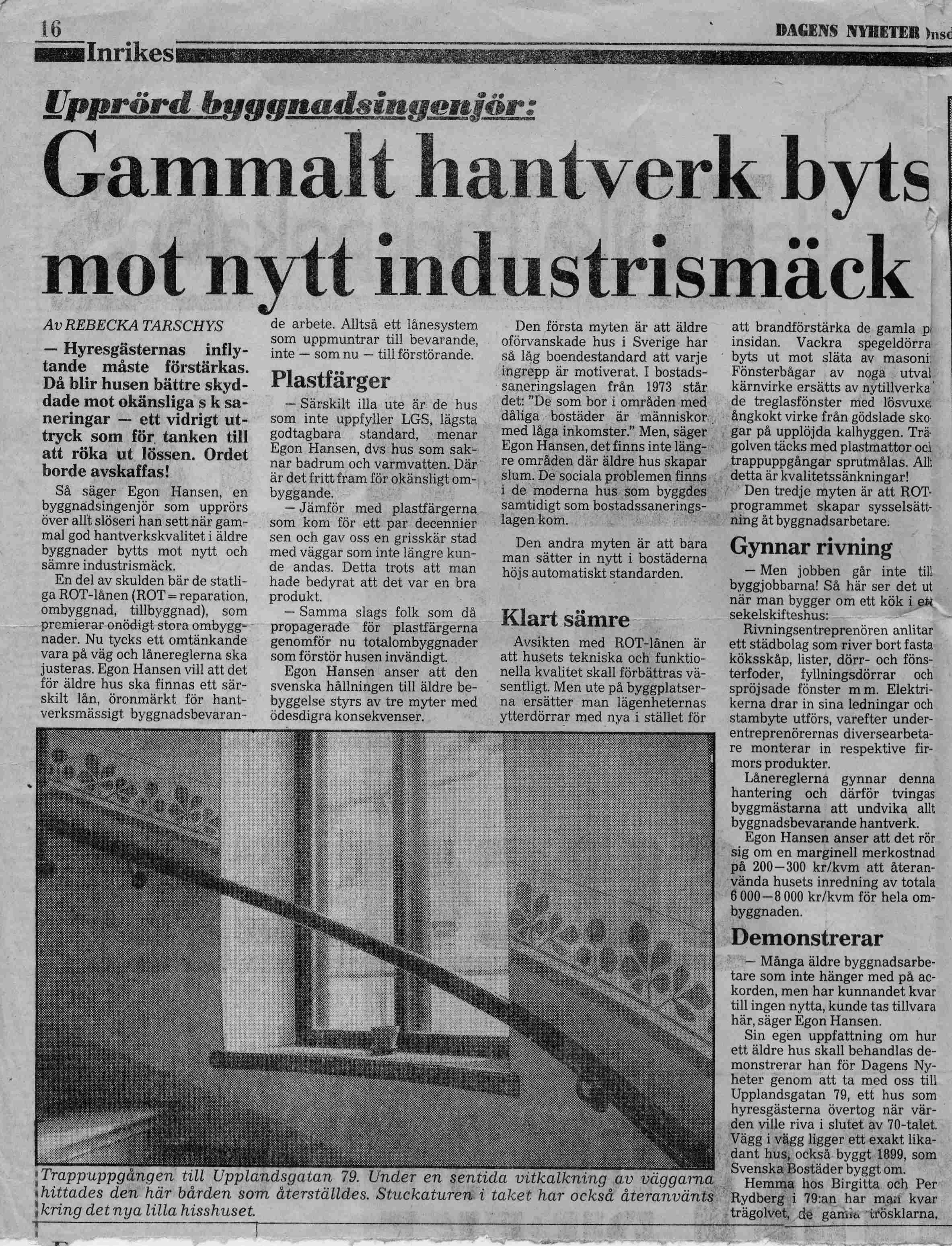 DN-artikel från 1986 om okänslig fastighetsrenovering inkl foton/reportage från Upplandsgatan 79 - sid 1 & sid 2